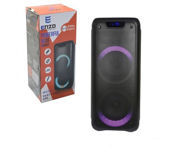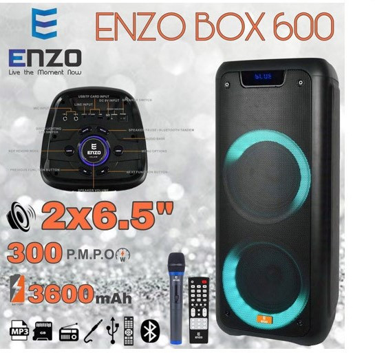اسپیکر چمدانی 600 انزو وسیله بسیار مناسب برای مراسم ها است. این اسپیکر از درگاه USB ،AUX و شیار TF کارت پشتیبانی می کند. همراه این اسپیکر ، میکروفون بیسیم و ریموت کنترل قرار دارد که شما را از خرید آن بی نیاز می کند. از دیگر ویژگی های این محصول می توان به حالت رقص نور آن اشاره کرد که با یک کلید می توان آن را فعال یا غیر فعال کرد. همچنین این محصول دارای یک ریموت کنترل می باشد و امکان پخش رادیو نیز دارد. این اسپیکر دارای چراغ LED می باشد که زیبایی این محصول را چند برابر کرده است. به لطف دو درایو 6.5 اینچی این محصول دارای صدای بسیار شفاف و با کیفیت می باشد.