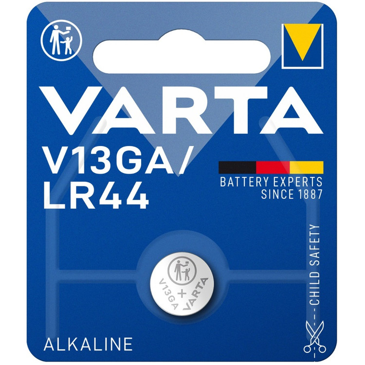 باتری سکه ای وارتا (VARTA) مدل V13GA که با نام LR44 نیز شناخته می شود، از پرکاربردترین باتری های سکه ای است که با مبدا برند کشور آلمان، تولید می شود.این باتری برای دستگاه های مختلف مانند ساعت مچی، ماشین حساب، سوئیچ ماشین، ریموت، تجهیزات پزشکی و دیگر دستگاه ها کاربرد دارد. باتری سکه ای V13GA از تکنولوژی آلکالاین ساخته شده، وزن آن 2 گرم است و 1.5 ولت ولتاژ دارد. کاربردهای متنوع، طول عمر و کارایی بسیار بالا، کمترین میزان تخلیه خود به خودی انرژی و آماده به کار بودن از ویژگی های بارز این محصول است. همچنین باتری سکه ای یا دکمه ای وارتا فاقد جیوه می باشد، بسته بندی ایمن برای کودکان دارد و انرژی را برای طولانی مدت یعنی بیش از 3 سال ذخیره سازی می کند.