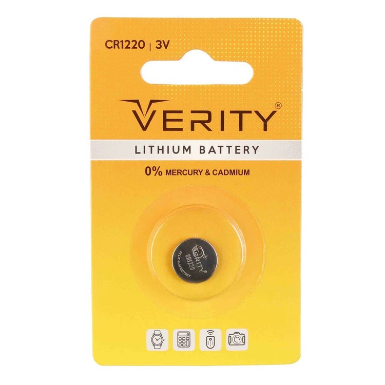 باتری CR1220 وریتی دارای قطری به اندازه 12 میلی متر و و ضخامت 2 میلی متر میباشد.این باتری دارای تکنولوژی لیتیومی میباشد . بسته بندی این محصول به صورت کارتی و تعداد 1 عدد میباشد.