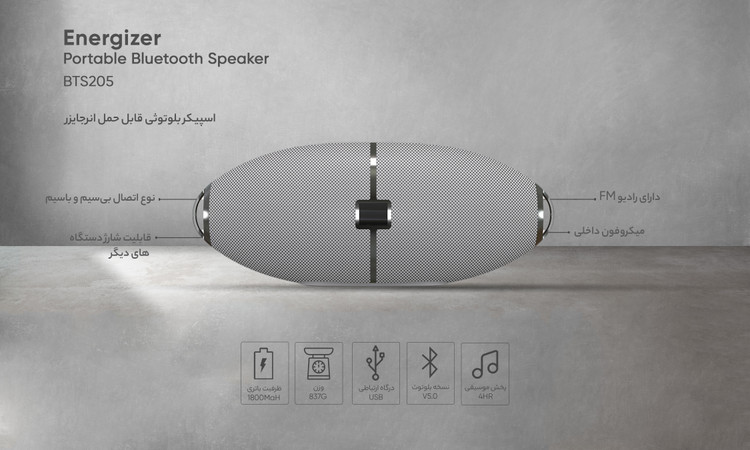 این اسپیکر بلوتوث با الهام از توپ راگبی طراحی شده است و طراحانان اسپیکر BTS205 با این ظاهر قدرت این اسپیکر را به رخ کشیدهاند. علاقه مند به گوش دادن موسیقی در هر زمان و مکانی هستید؟ آیا شما هم همیشه یک فلش مموری با آهنگ های مورد علاقه خود را همراهتان دارید؟ با اسپیکر بلوتوث مدل BTS205 انرجایزر میتوانید در هر جا به موزیکهای داخل فلش مموری خود گوش کنید. توان 10 واتی این اسپیکر تضمین کننده صدایی با کیفیت و صاف است و با فرکانس 30Hz-20kHz هرتز خود محدوده شنوایی شما را پوشش میدهد. علاوه بر فلش مموری که در بالا اشاره شد اسپیکر بلوتوث انرجایزر از رم میکرو و کابل AUX نیز پستیبانی میکند. فراموش نکنید که این اسپیکر یک اسپیکر بلوتوثی است و شما آن را به هر پلیری که قابلیت بلوتوث دارد میتوانید کانکت کنید. این محصول از رادیو FM هم پشتیبانی میکند و شما میتوانید برنامه رادیوی مورد علاقه خود را با آن دنبال کنید. امکان ویژه دیگری که در این محصول تعبیه شده است، قابلیت استفاده این محصول به عنوان پاوربانک است. یعنی با یک تیر چند نشان میزنید.